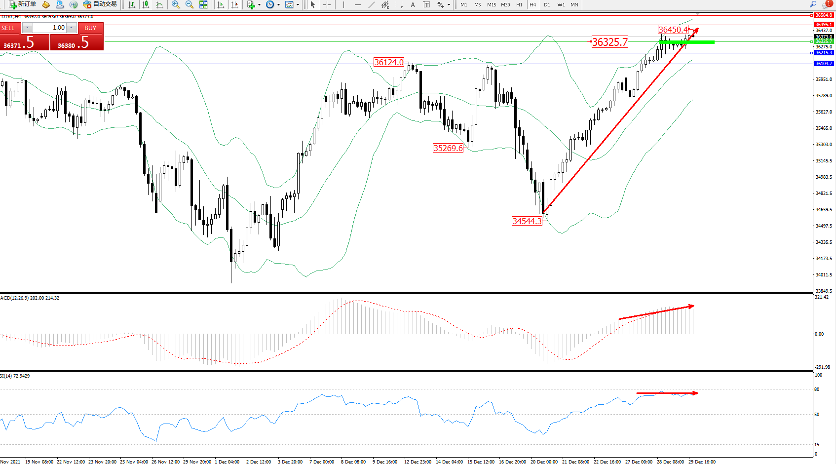 技术点评:多头动力延续布林带指标中上轨区间持续震荡上扬,高位抵达36450附近节点后有继续攀升态势,布林带指标拉升上扬走势态势良好,多头动力并未有止步迹象,MACD指标处于多头区域维持整理平移,RSI指标处于多头区域超买区80均衡线下侧弱势徘徊中;