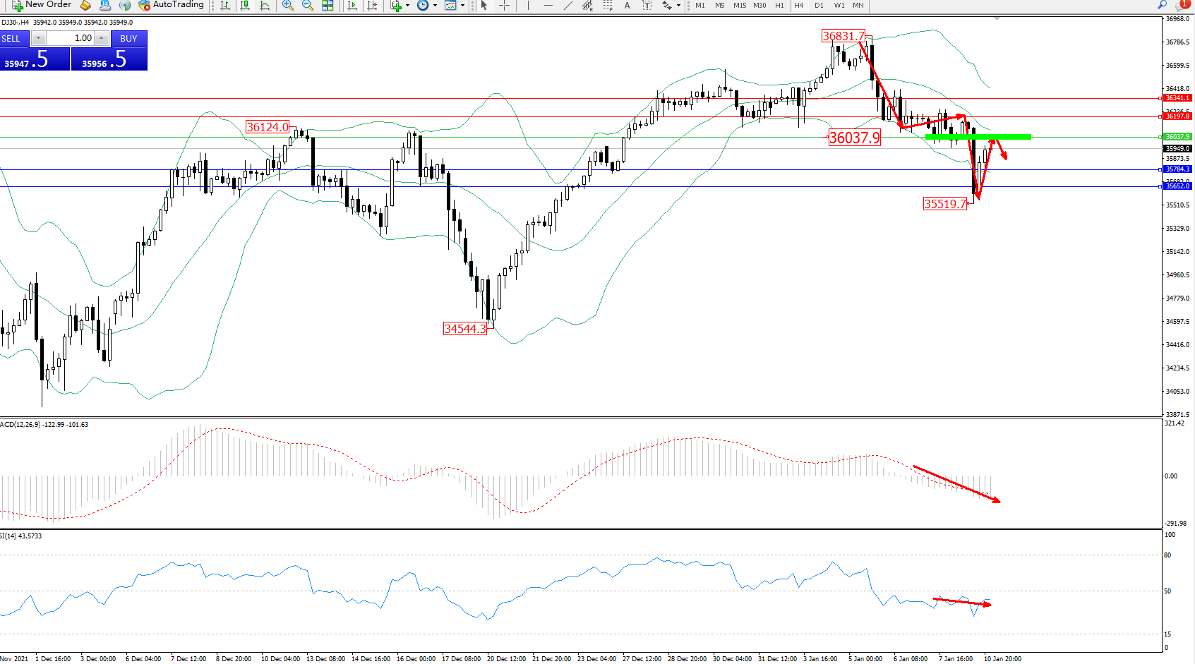 技术点评:空头动力延续布林带指标通道中下轨区间持续震荡下行,低位抵达35519位置后得到支撑反转上移,短期多头动力伺机入场,但整体下行趋势态势良好,布林带指标呈下行趋势走势良好,MACD指标处于0轴线下方空头区域维持整理下行,RSI指标处于50均衡线下方维持震荡中;