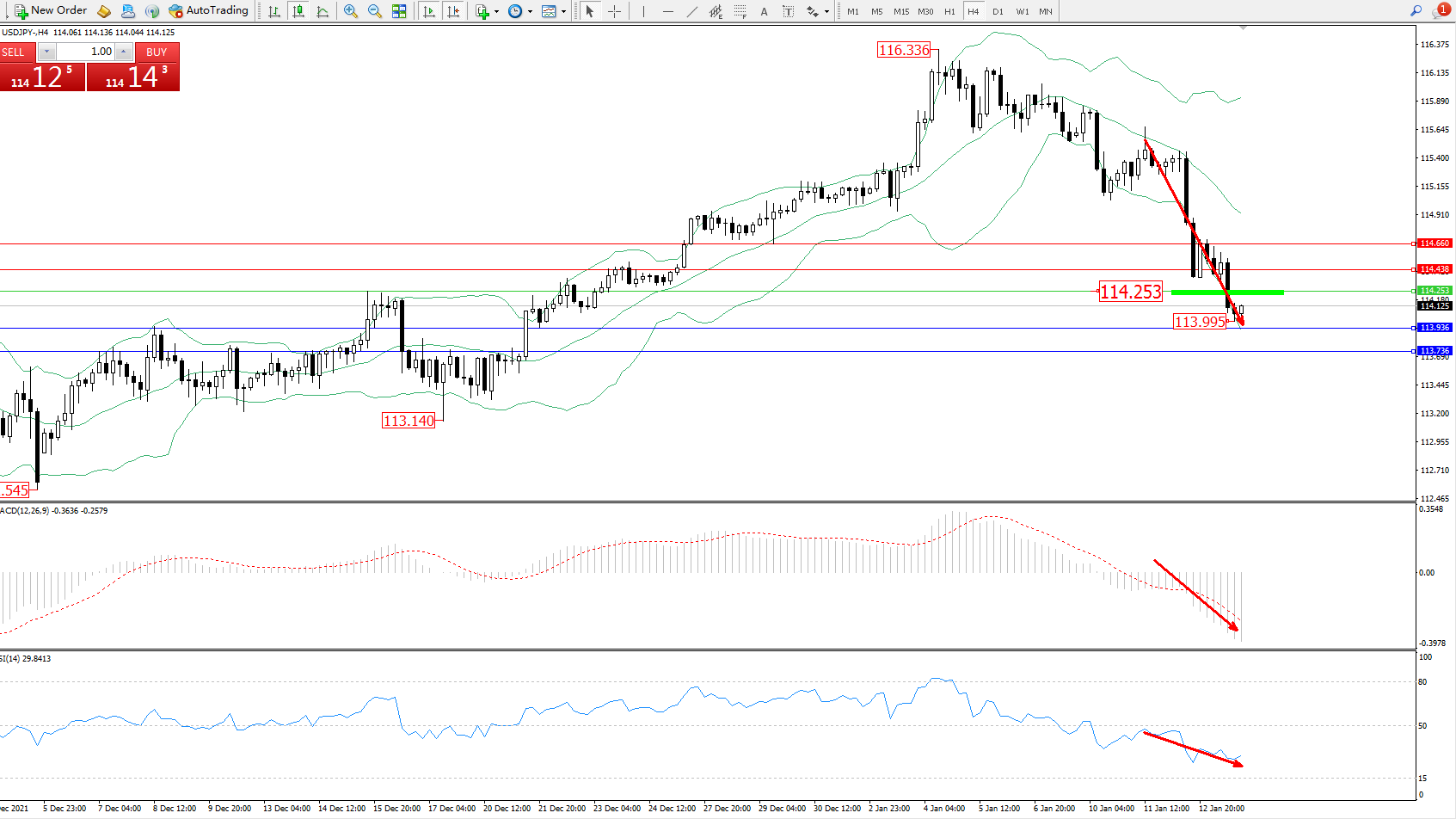 交易策略:114.253下方看跌,目标113.936、113.736