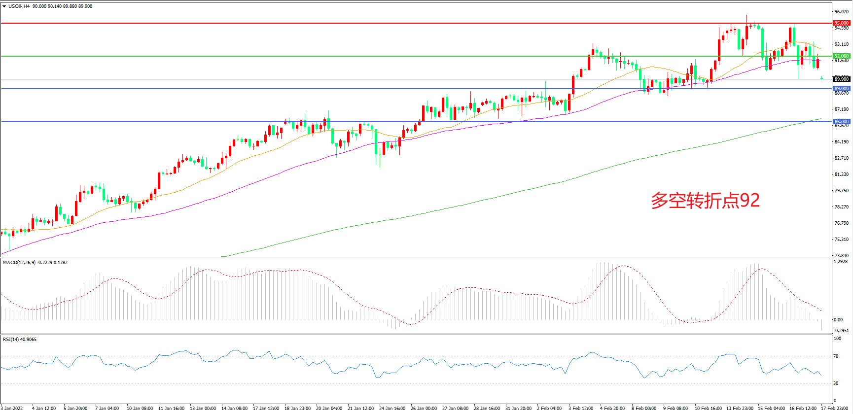 周四(2月17日),美国总统拜登声称,俄罗斯可能在“接下来几天内”对乌克兰发起攻击,地缘政治风险加剧,美国WTI原油冲高回落,收报91.73美元/桶。目前俄乌局势紧张和伊核谈判是影响油市最重要的两大因素,如果伊核谈判再起波澜,油价可能会出现回落,短线延续区间震荡概率较大。