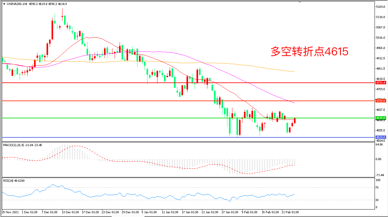 4小时图看,沪深300围绕4515一线窄幅震荡,短期有企稳迹象, MACD绿柱缩短,RSI指标走平,日内延续震荡概率较大。