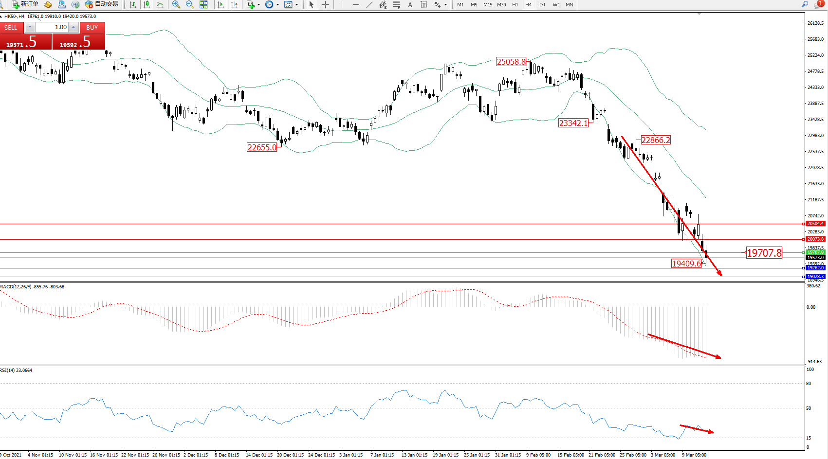 香港恒生指数3月14日(周一)收盘下跌1022.13点,跌幅4.97%,报19531.66点;港股午后加速下跌,恒生科技指数大幅收跌11.03%盘中续创新低,创历史最大单日跌幅,行业板块近乎全挫,市场情绪降至冰点,抛售潮愈演愈烈。大型科技股领衔大市走低,百度跌17.9%,美团跌16.8%,京东跌14.77%,快手、阿里巴巴跌超10%,腾讯、小米跌超8%;惟香港银行板块个别上涨,恒生银行、汇丰控股逆势走俏。今日南下资金逆势净流入68.95亿港元,大市成交额放大至2230亿港元。香港新增26908宗确诊个案,累计增至73多万人染疫,近三日每日报告确诊人数维持约2万至3万宗水平,未呈回落趋势。过去24小时,呈报死亡个案再增286宗,疫情以来累计共4279名患者离世,突破4000水平。