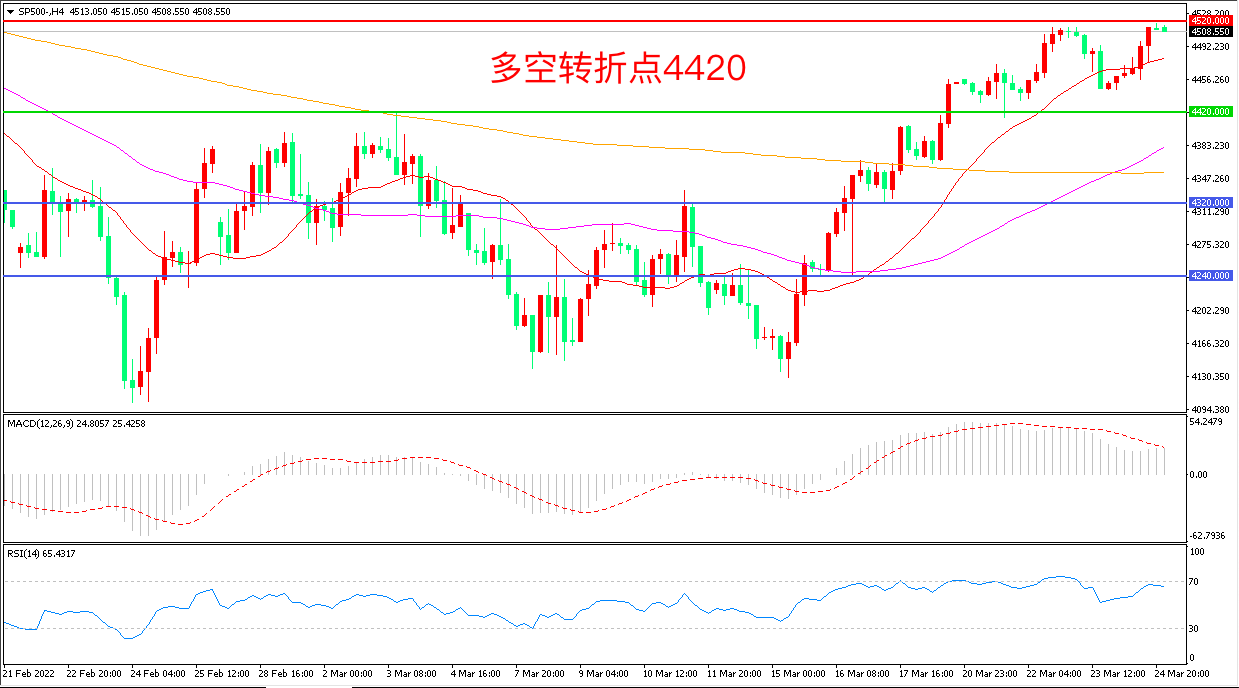 周四(3月24日),美国部分经济数据优于预期,联储高官继续发表鹰派言论,美债价格回落支撑美股大幅反弹,标普500强势上行,收报4420.00点。过去八个交易日里,美股有第六日交易日收涨,风险情绪逐渐回升的推动下,美股延续强势概率较大。