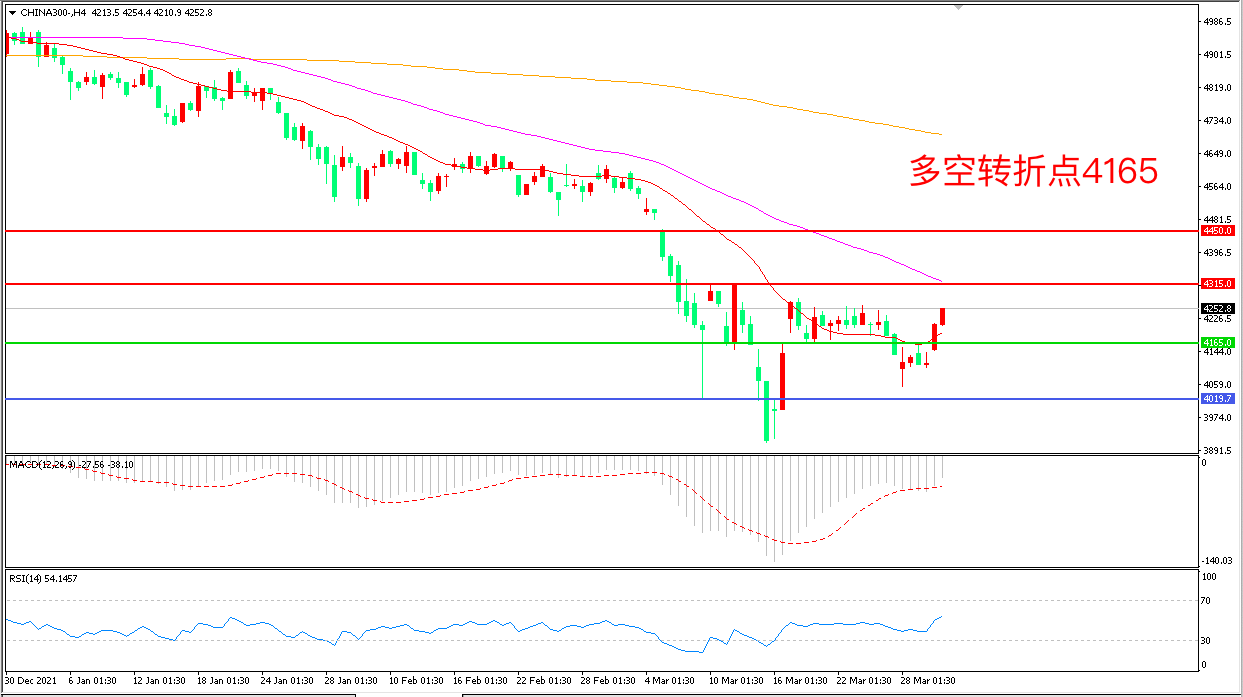 4小时图看,沪深300触底反弹,短线走势有所回暖,均线系统逐渐走平, MACD绿柱缩短,RSI指标走平,日内震荡上行概率较大。