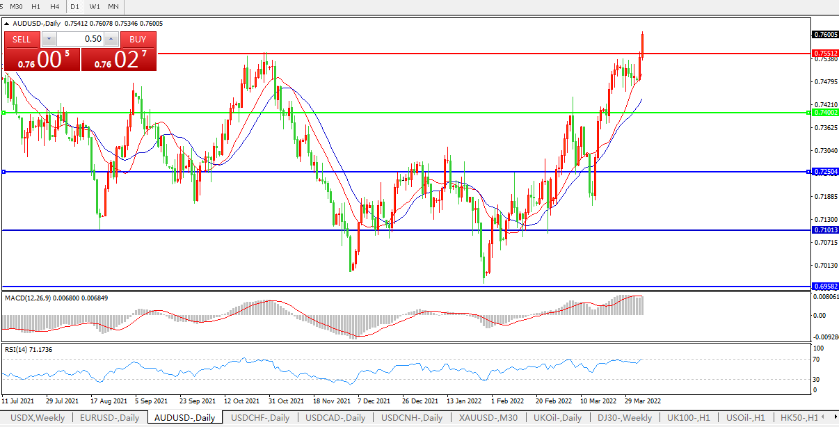 交易策略:0.7400上方看涨,目标0.7550、0.7650