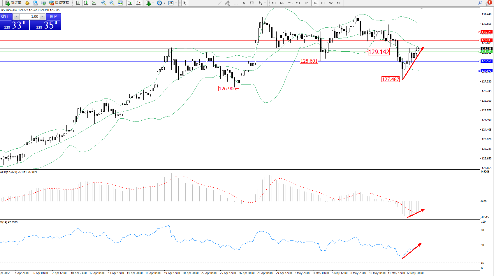 技术点评:高位空头动力短暂震荡下挫至127.487附近节点后,多头动力伺机入场强势拉升,触及布林带指标中轨附近节点整理,短期多头反转上移走势或将延续,布林带指标呈张口走势不断下移后开始收口,MACD指标处于空头区域维持整理缓慢上移,RSI指标处于空头区域维持震荡上移至50均衡线下侧徘徊;