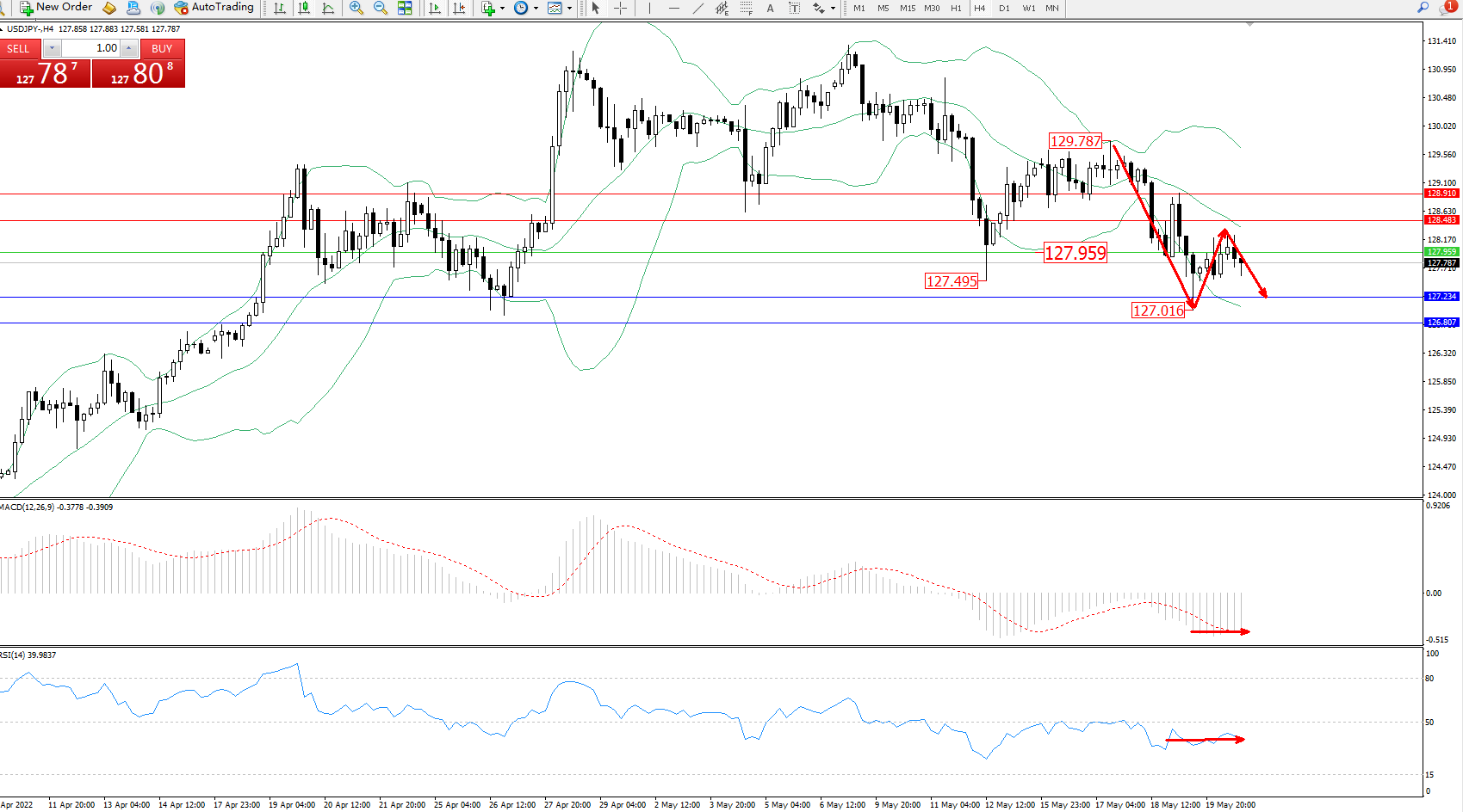 技术点评:空头动力延续布林带指标通道中下轨区间持续震荡下行,低位抵达127.016附近节点后开始震荡,短期多头反转上移,即将触及布林带指标中轨附近节点,布林带指标呈张口走势后开始收口,空头动力不断震荡下行,MACD指标处于空头区域低位维持整理,RSI指标处于50均衡线下侧维持徘徊;