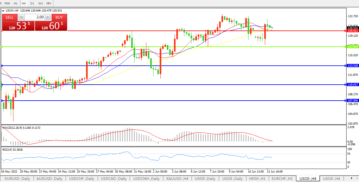 4小时图看,油价运行于均线附近,短线继续盘整概率较大 MACD动能柱逐步缩短RSI指标中性,日内继续整理概率较大。