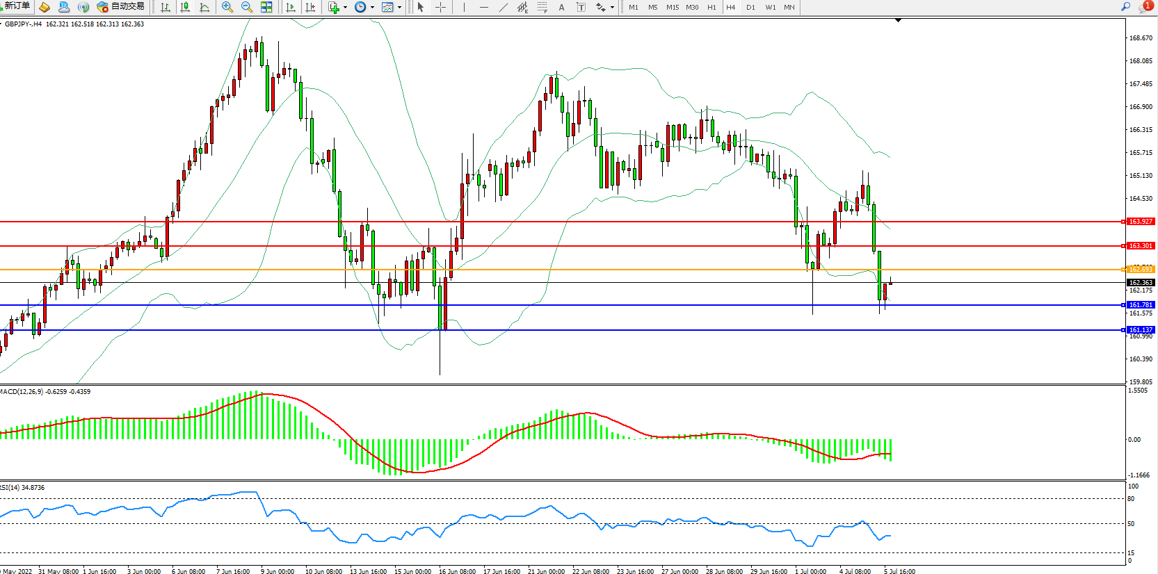 英镑兑日圆跌至162.363附近震荡,目前英国CPI同比涨幅将接近11%,这证实了英国经济的周期性前景仍然严峻——事实上,在2023年之前的未来六个季度,英国的累计增长将是G10中第二低的。