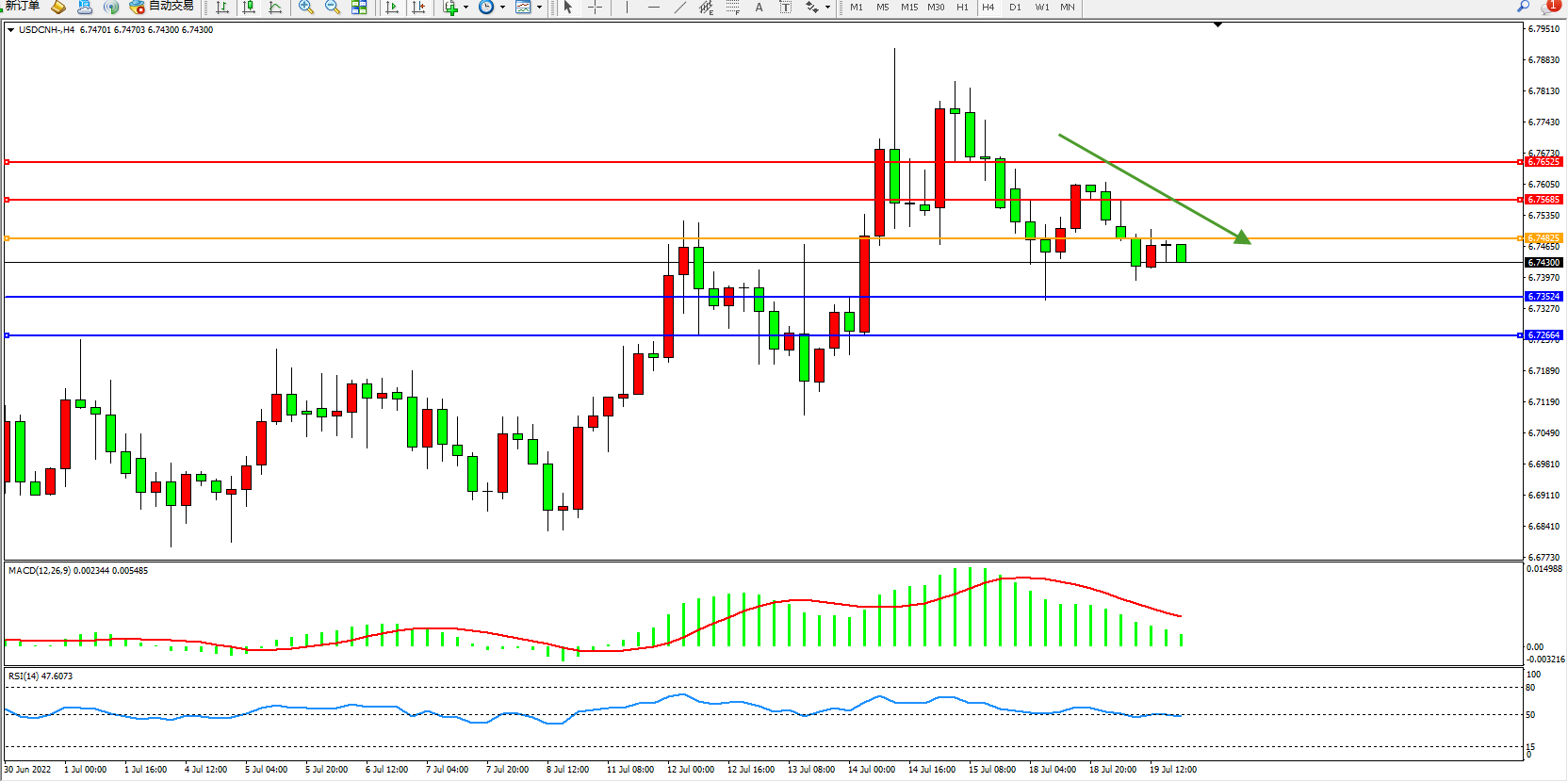 备选策略:6.74825上方看涨,目标6.75685、6.76525