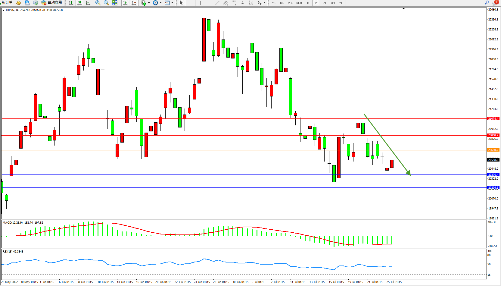 香港恒生指数7月25日(周一)收盘下跌46.2点,跌幅0.22%,报20562.94点;港股午后跌幅收窄,恒指尾盘近乎飘红,恒生科技指数跌1.38%,盘中一度跌超2.5%。今日南下资金净流入13.04亿港元,大市成交额为893亿港元。由于中国的周期性向上趋势、通胀温和及央行积极政策支持下,料中国股市可成为一个相对的“避风港”,将恒指今年底目标由27000点降调至24500点,潜在升幅约有,认为恒指盈测下调将会稳定,甚至下半年或可有所改善。