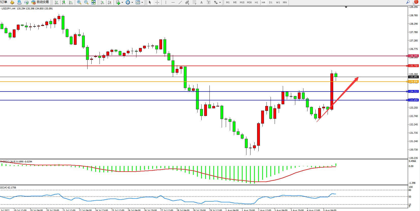 4小时图看:低位多头动力强势震荡拉升,市场看涨情绪笼罩,多头有继续攀升态势,MACD指标处于0轴线上側徘徊,RSI指标处于50均衡线上側窄幅整理;