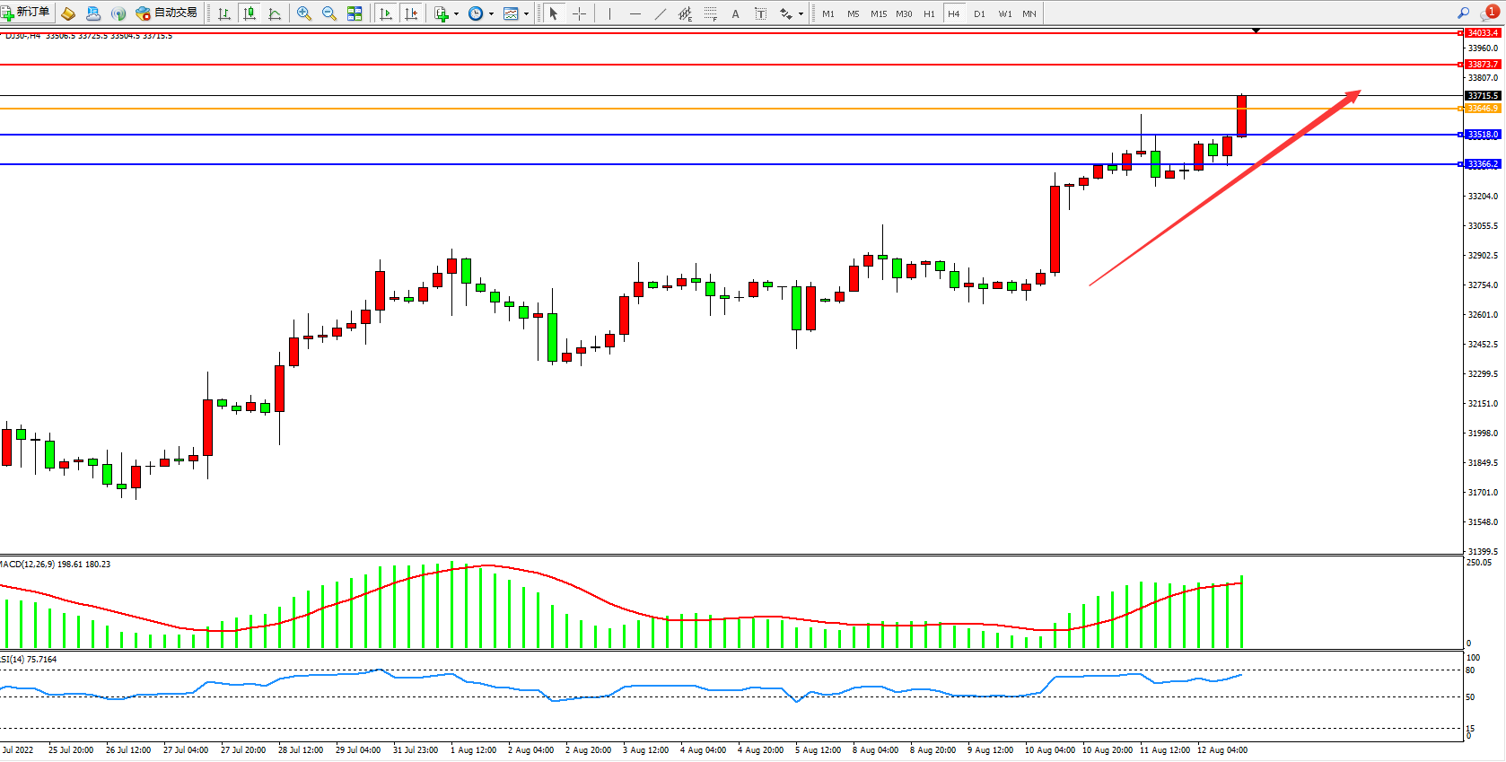 道琼斯指数8月12日(周五)收盘上涨424.77点,涨幅1.27%,报33761.44点;美国的通胀已经降温,之后市场参与者调低了对美联储激进加息的预期;投资者评估通胀明显放缓是否会降低美联储加息的速度。