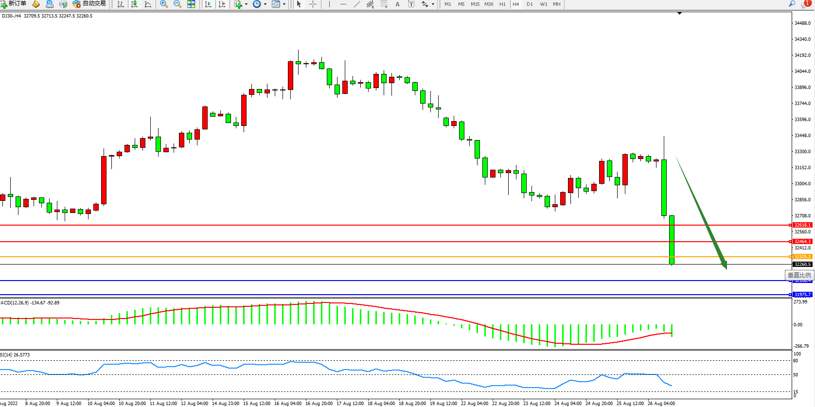道琼斯指数8月26日(周五)收盘下跌1008.38点,跌幅3.03%,报32283.40点;杰克逊霍尔央行年会,美联储主席鲍威尔演讲异常简洁直接,旨在传达美联储降低通胀的决心。