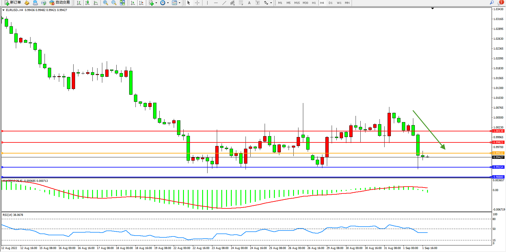 交易策略:0.99532下方看跌,目标0.99154、0.98880