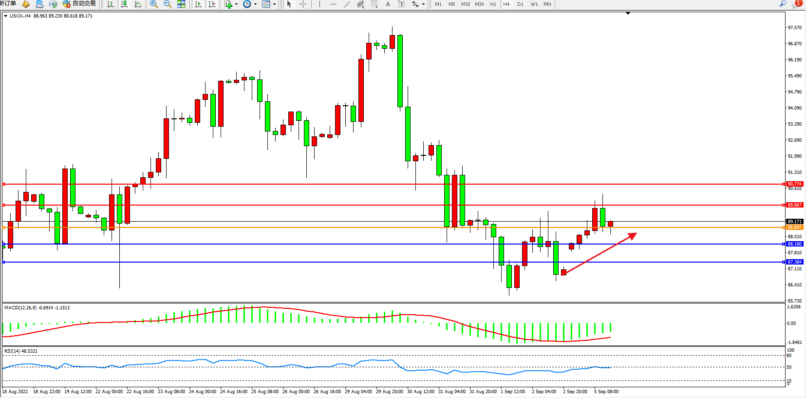 交易策略:88.897上方看涨,目标89.867、90.774
