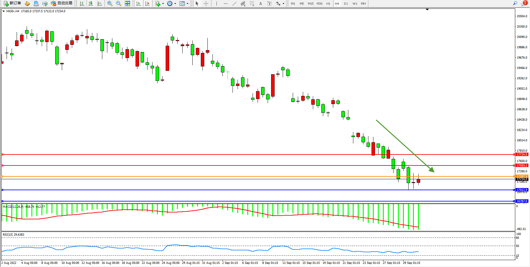 香港恒生指数9月30日(周五)收盘上涨56.96点,涨幅0.33%,报17222.83点;港股三大指数涨跌不一,盘中一度跌近17000点整数关口的恒指收涨0.33%,国指涨0.03%,恒科指盘中一度跌2.7%,创指数成立以来新低,最终收跌0.93%。金融股全天强势,教育、医药、香港本地股表现活跃。科技股普遍下跌,蔚来挫7%领跌恒科指成分股,理想汽车、小鹏汽车跌约4%,美团、快手跌2%,腾讯跌1.5%续创回调以来新低。
