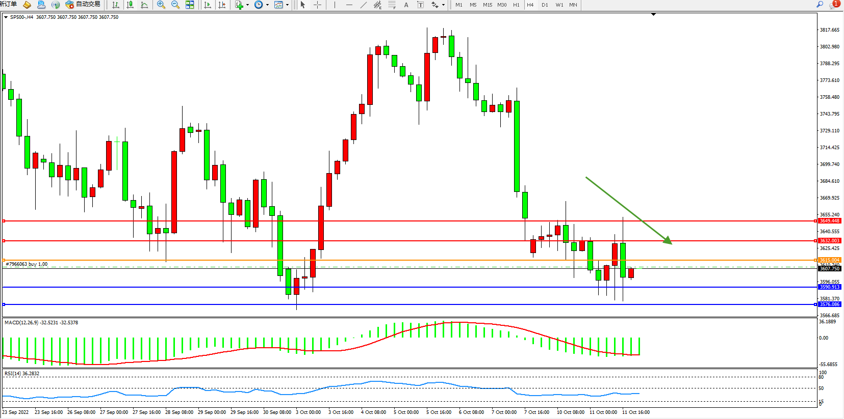 标普500指数10月11日(周二)收盘下跌22.89点,跌幅0.63%,报3589.50点;美联储官员暗示,利率将在更长时间内保持高位,排除了2023年政策过早转向的可能性。激进加息预期应该会给实际收益率带来上行压力,使本已接近数十年高位的美元保持进一步升值的趋势。