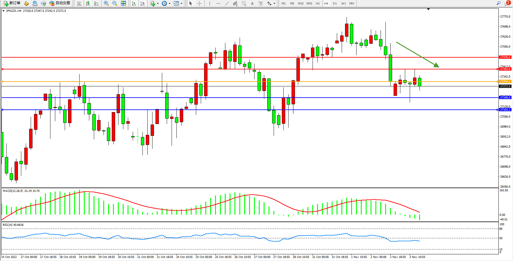 日经225指数11月2日(周三)收盘下跌14.42点,跌幅0.05%,报27664.50点。东京证券交易所文化节,休市一日。日本央行9月会议记录显示,决策者注意到通胀压力日益增大,黑田东彦表示,利率将在“两到三年内”保持低位,这一言论导致日元大跌,后来促使政府出手干预以支撑本币。