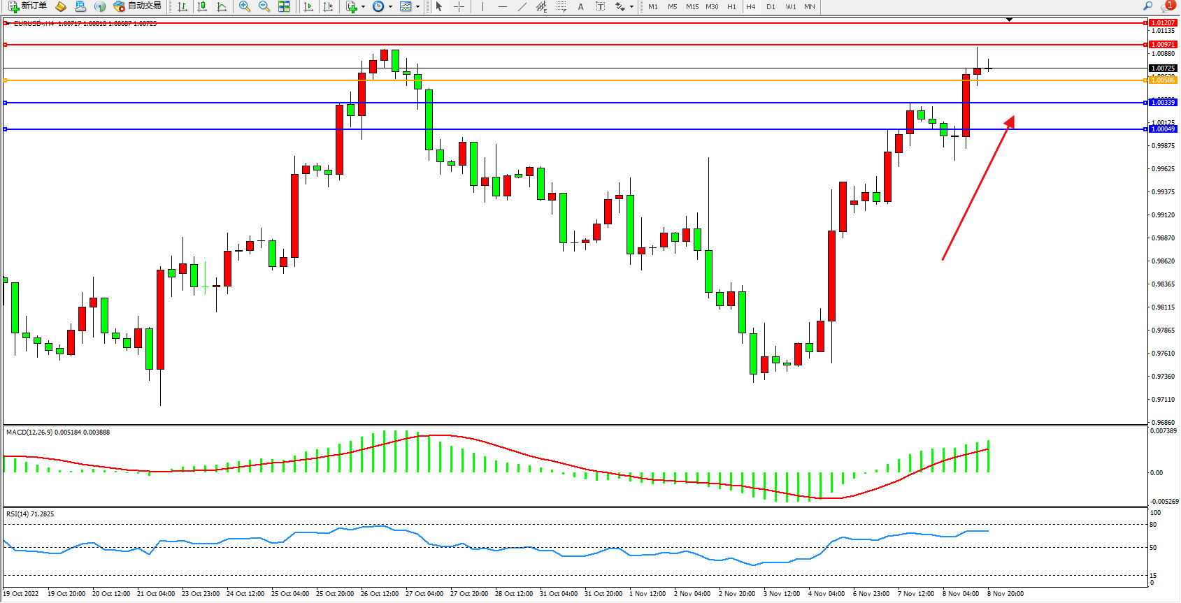 4小时图看:多头动力阶梯式震荡拉升,短期高位看涨情绪依旧,市场有继续攀升态势,MACD指标处于多头区域高位整理上移,RSI指标处于多头区域高位徘徊;