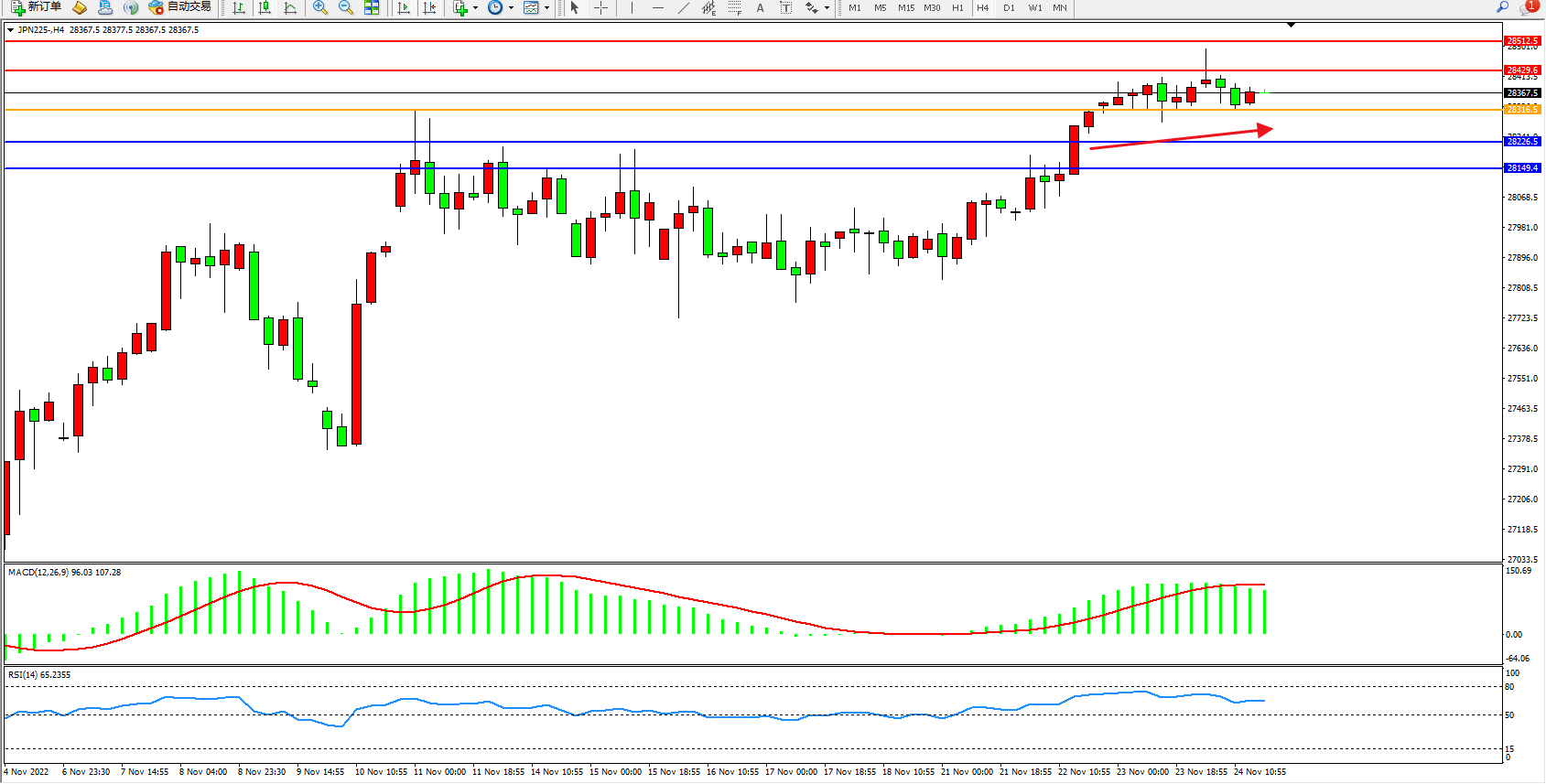 日经225指数11月24日(周四)收盘上涨276.76点,涨幅0.98%,报28392.50点。本厚生劳动省公布的涨薪情况调查显示,今年内实施或计划涨薪的企业较上年增加5.0个百分点,达到85.7%,是3年来首次增加占比。随着经济活动重启,住宿和餐饮业有所改善,成为推升整体比例的主要因素。