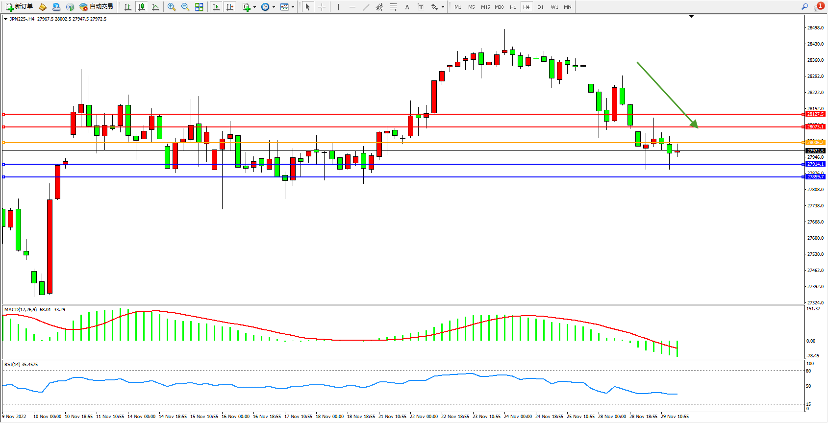 日经225指数11月29日(周二)收盘下跌117.83点,跌幅0.42%,报28045.00点。据路透调查:预计日本2022财年GDP增长1.7%,2023财年增长1.2%(10月调查结果为1.9%和1.3%)。预计日本2022财年核心CPI同比增长2.7%,2023财年同比增长1.7%。