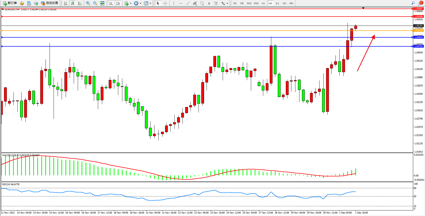 欧元美元EURUSD—4小时K线图显示: