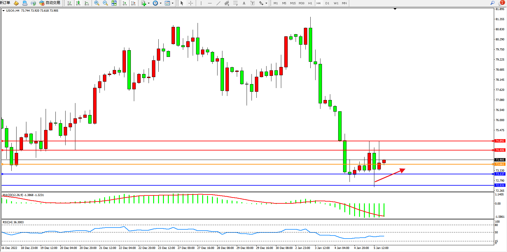 4小时图看:空头动力急速下挫后,低位短期得到支撑震荡,多头动力有伺机入场迹象,但依旧处于低位震荡中,MACD指标处于空头区域低位震荡,RSI指标处于空头区域整理后开始有上移迹象;