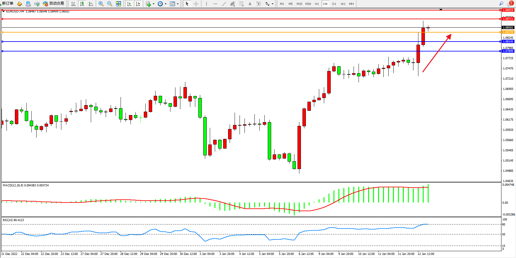 欧元美元EURUSD—4小时K线图显示: