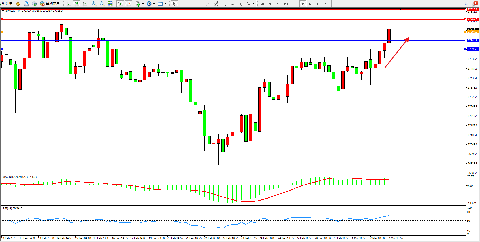 日经225指数3月2日(周四)收盘下跌10.03点,跌幅0.04%,报27506.50点。日本企业第四季连续第七个季度提高工厂和设备支出,这让指望私营部门需求主导经济从疫情中复苏的政策制定者松了一口气。