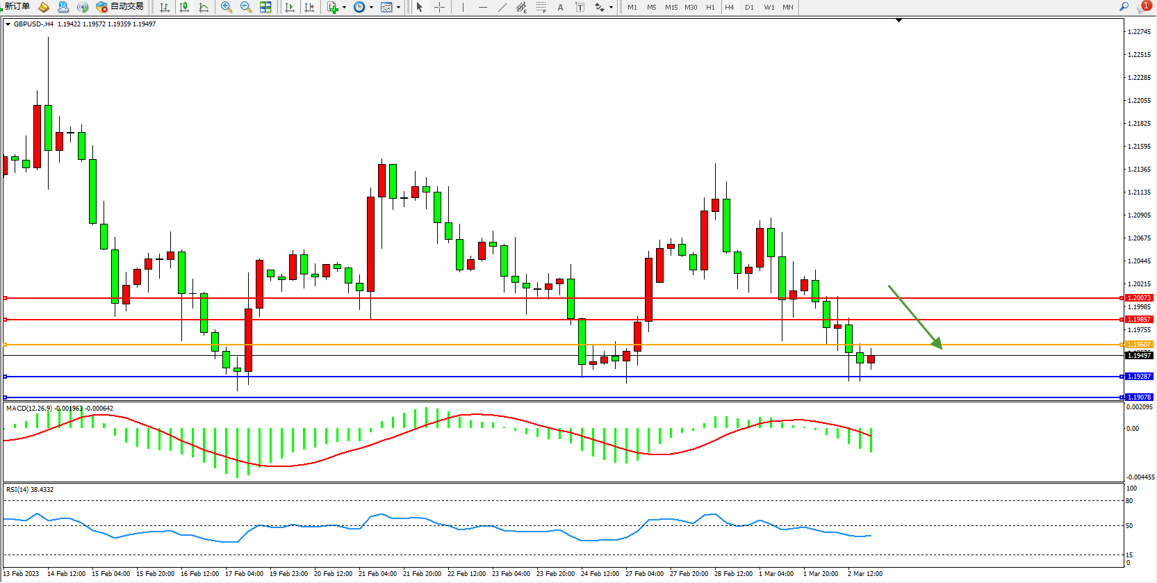 交易策略:1.19607下方看跌,目标1.19287、1.19078