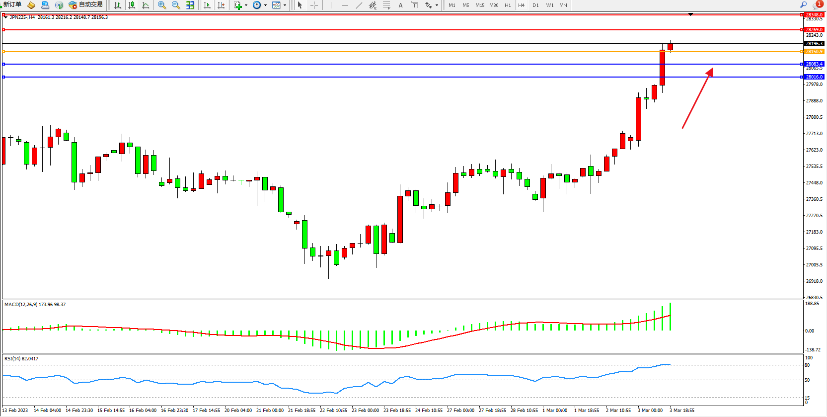 日经225指数3月3日(周五)收盘上涨417.63点,涨幅1.52%,报27916.50点。随着新冠疫情对全球经济的影响消退,日本2月服务业活动以8个月以来最快的速度增长。2月日本经季节调整的服务业采购经理指数(PMI)终值从1月的52.3升至54。