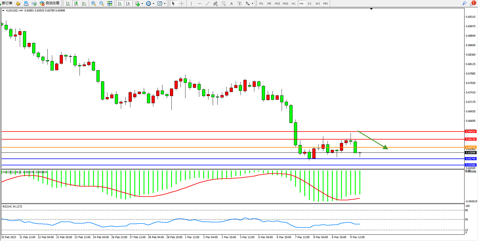 交易策略:0.66028下方看跌,目标0.65740 0.65580