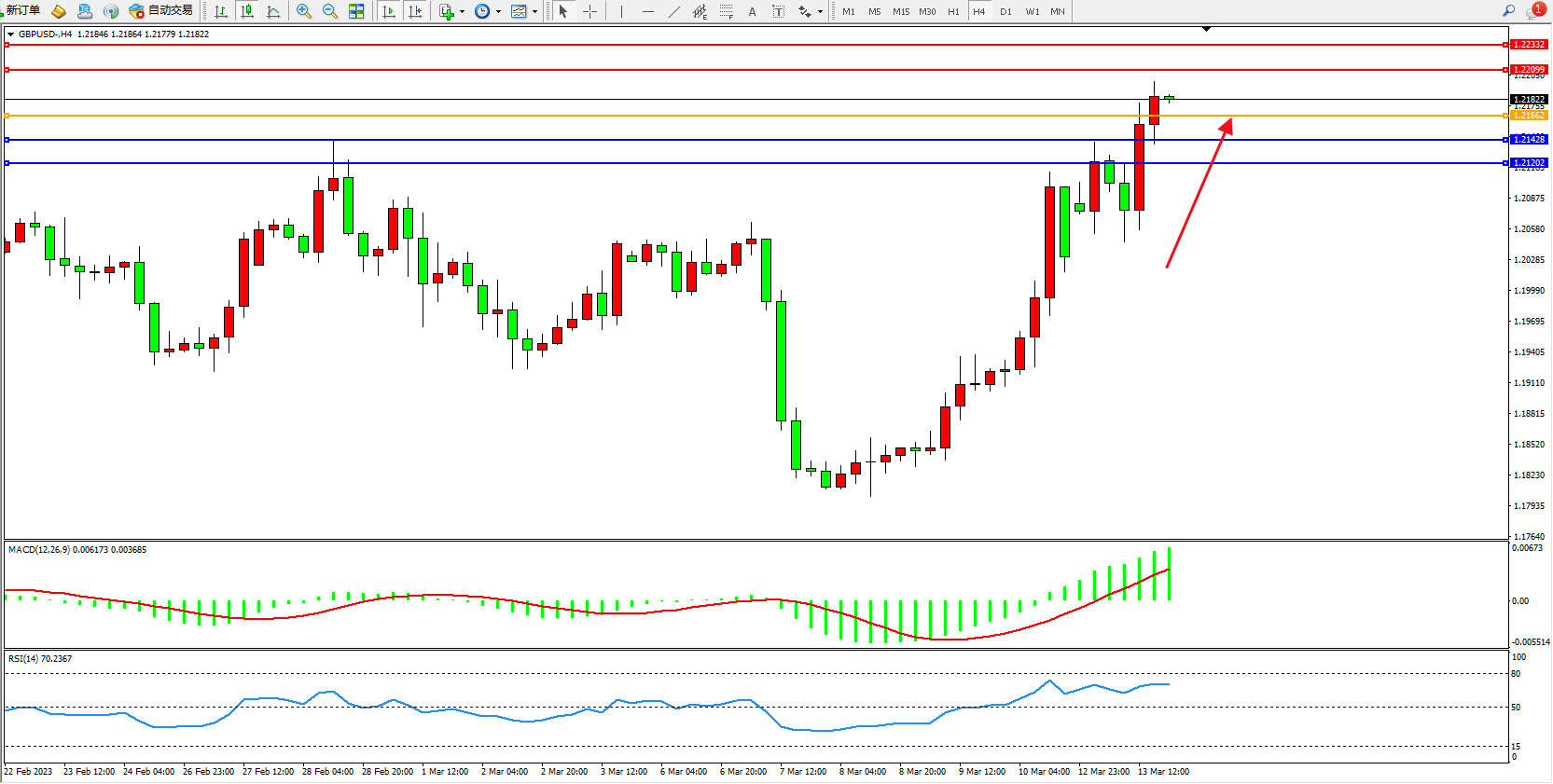4小时图看:多头动力高位持续震荡上扬,短期看涨情绪笼罩,市场多头动力不断向上移动中,MACD指标处于多头区域不断向上移动,MACD指标处于多头区域高位徘徊;
