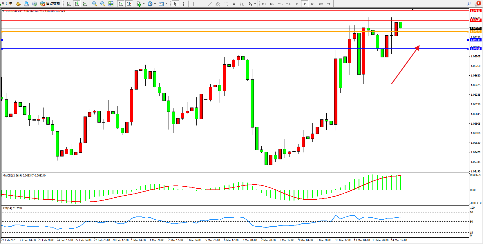 欧元美元EURUSD—4小时K线图显示: