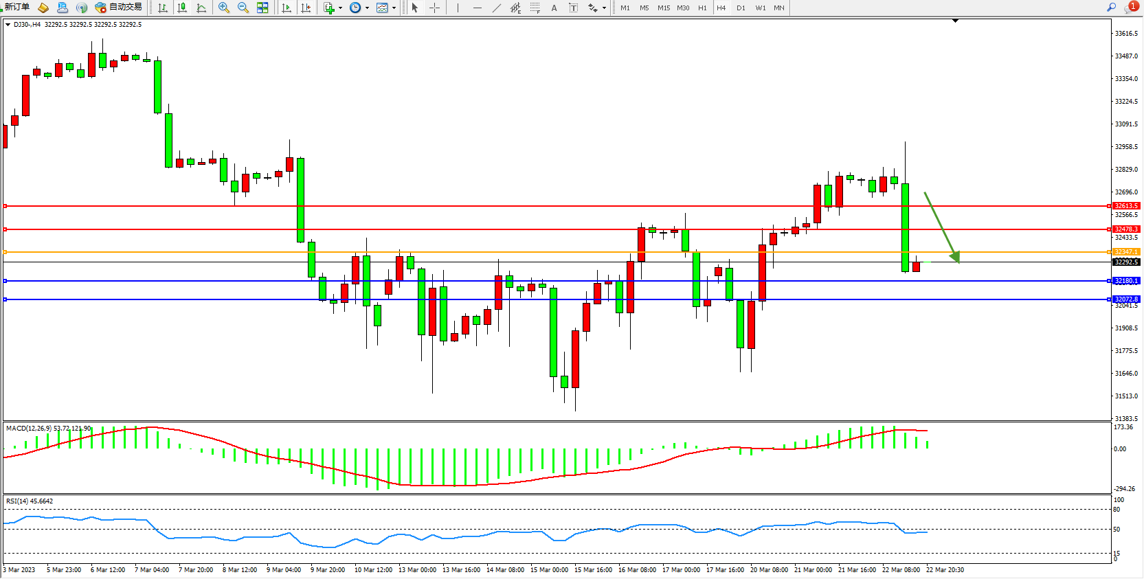 道琼斯指数3月22日(周三)收盘下跌531.70点,跌幅1.63%,报32028.90点;美联储如期升息25基点,至4.75-5.00%,符合预期。本次美联储决议声明上看,美联储措辞偏鸽派,美联储下调了长期利率预期,且下调了经济增速预期。