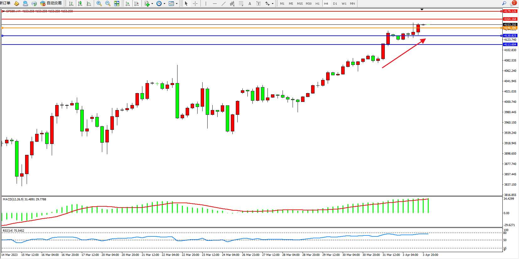 标普500指数4月3日(周一)收盘上涨14.54点,涨幅0.35%,报4123.85点;银行业危机迫使美国金融机构减少放贷,利率敏感行业将经历一段困难时期,市场等待3月份非农就业报告公布后才会确定走势。