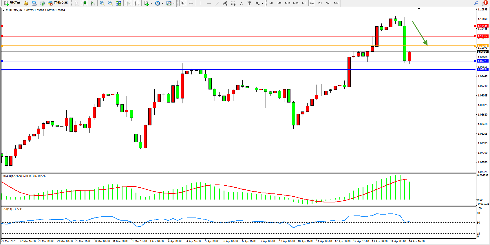 4小时图看:高位空头动力急速下挫,市场空头情绪笼罩,短期有继续下行移动态势,MACD指标处于多头区域高位缓慢下行,RSI指标处于多头区域震荡下移至50均衡线附近弱势整理;