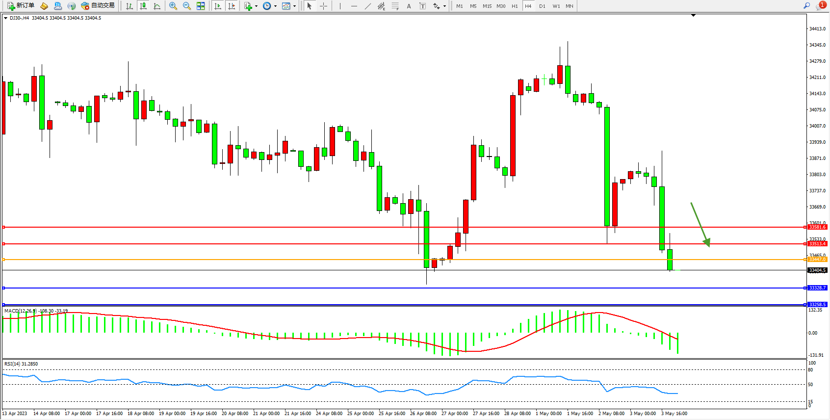交易策略:33447下方看跌,目标33328 33258