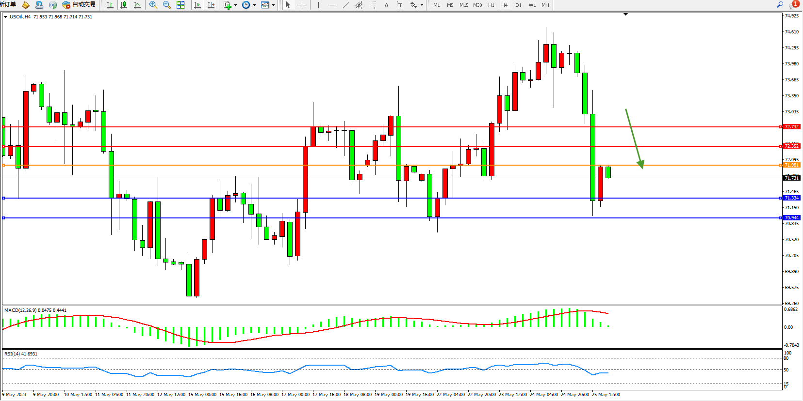 原油维持71.981附近震荡,由于美国是否会避免债务违约存在不确定性,稀释了OPEC+进一步减产预期带来的利好。尽管中国未来需求向好料限制油价下行空间。