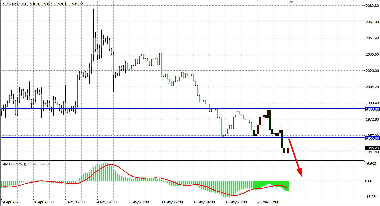 周四(5月25日)由于围绕美国债务上限谈判出现重大进展,降低了对黄金的避险需求,同时美国初请失业金数据继续上升,推高市场了对美联储再次加息的押注,现货黄金跌至3月22日以来最低点,最终收跌0.83%。