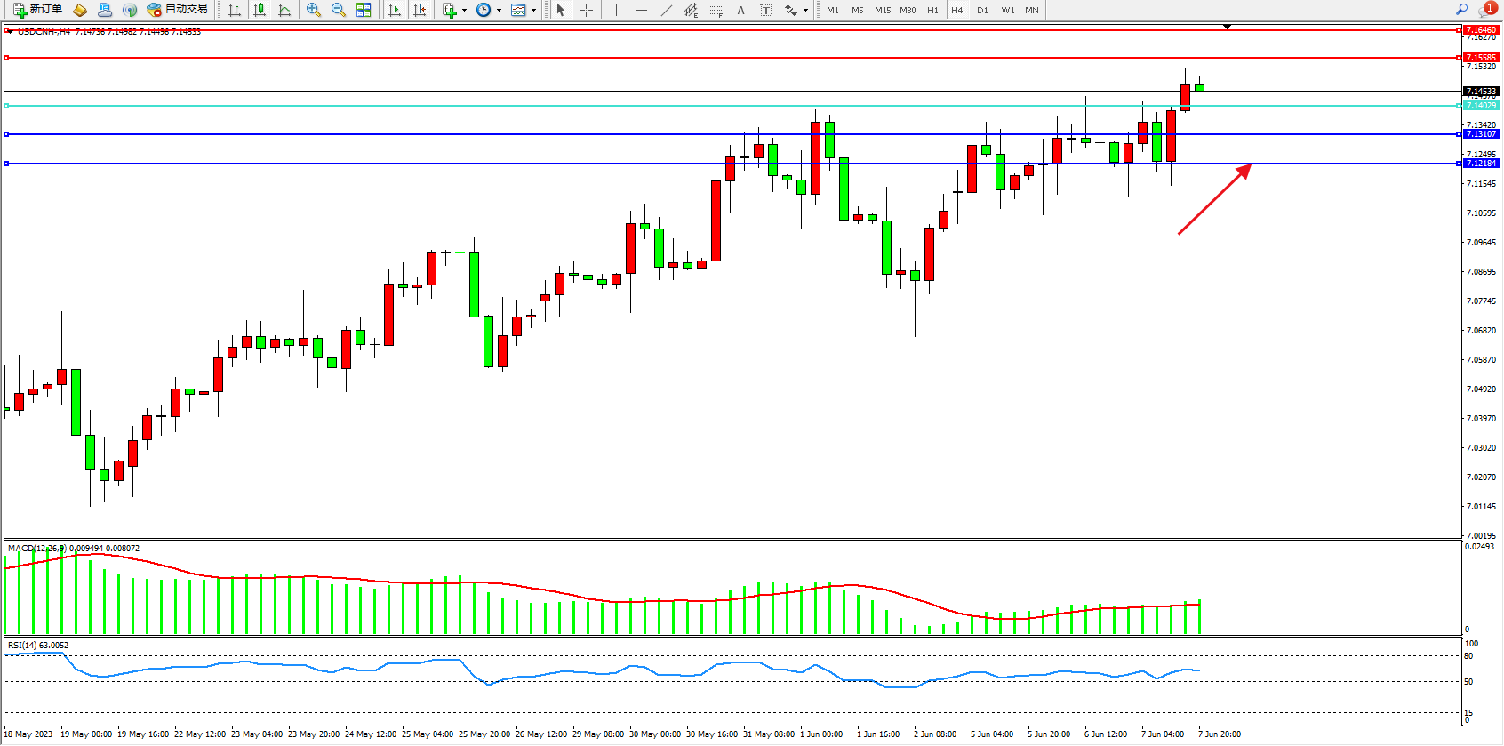交易策略:7.14029上方看涨,目标7.15585 7.16460