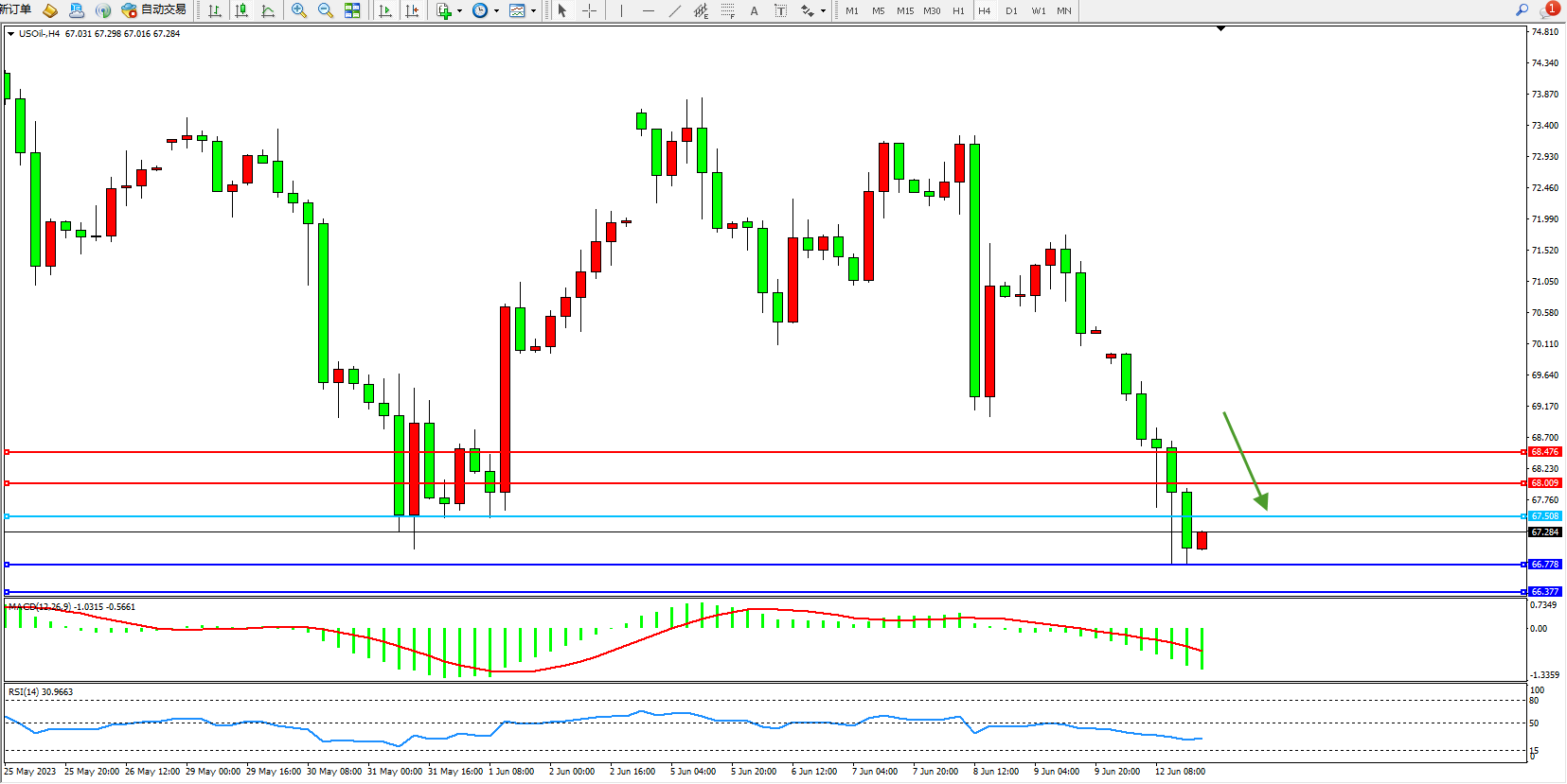 交易策略:67.508下方看跌,目标66.778  66.377