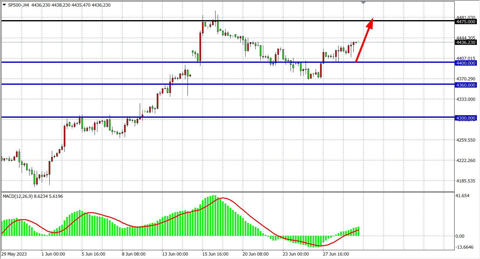 4小时图看,标普在4400之上进一步走高,MACD量能零轴上延续小幅放量,行情延续反弹势头,重点关注4000点关口支撑,该位之上继续看涨4475-4500。