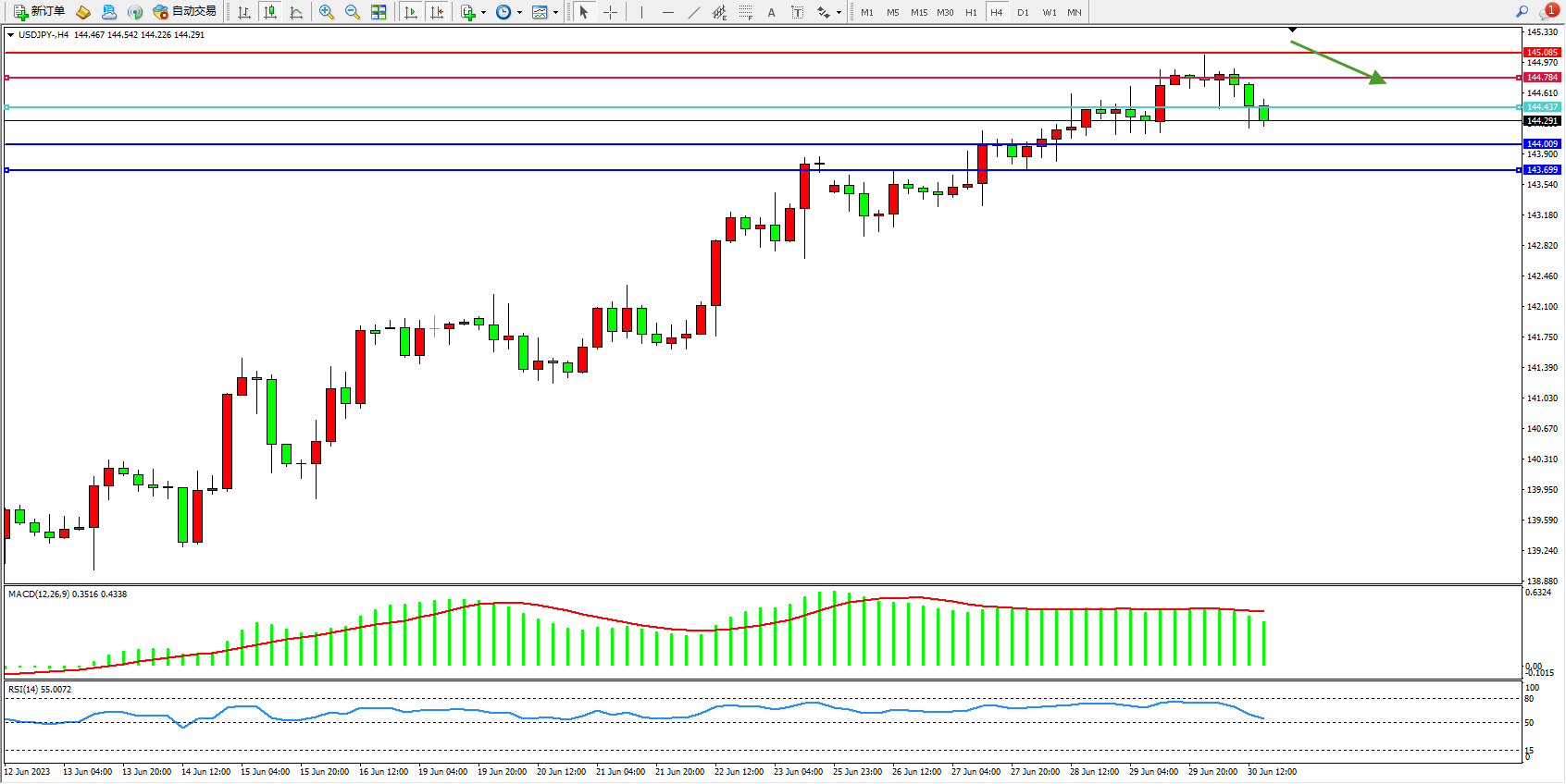 4小时图看:高位空头动力缓慢回撤,市场空头情绪涌现,短期有继续下移迹象,,MACD指标处于多头区域高位整理,RSI指标处于多头区域缓慢下行;