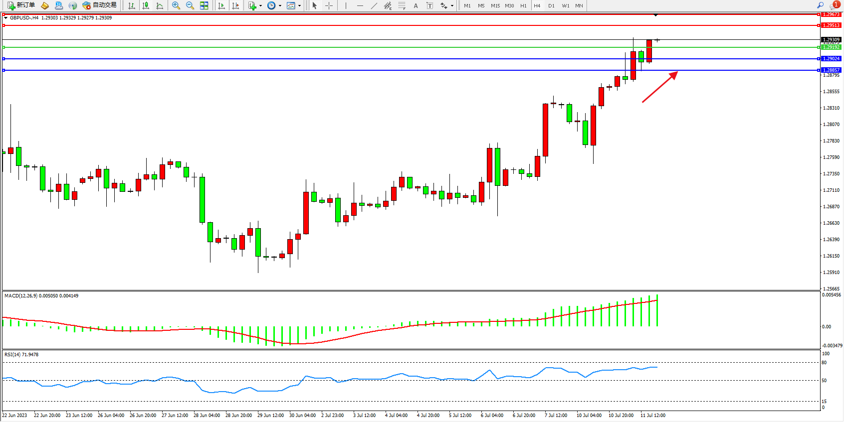 4小时图看:高位多头动力持续震荡上扬,短期看涨情绪依旧,市场多头不断攀升,MACD指标处于多头区域高位上移,RSI指标处于多头区域持续上行;