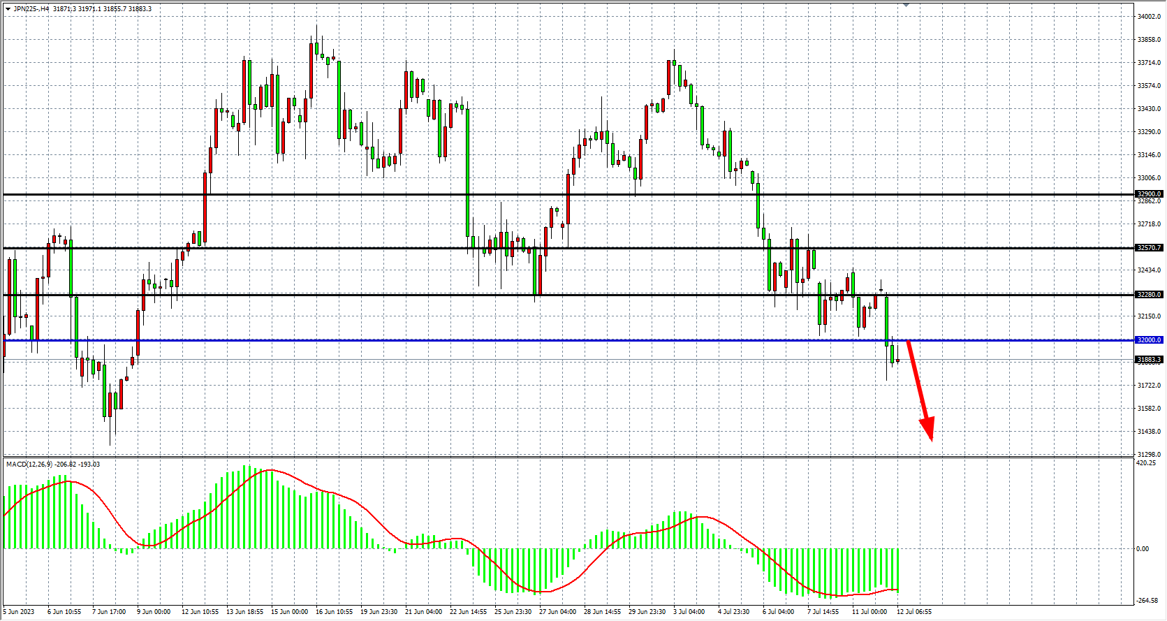 4小时图看,日经指数在32000之下继续走弱,MACD量能在零轴下持续放量,空头行情延续,阻力关注32000-32300,支撑关注31600-31300。