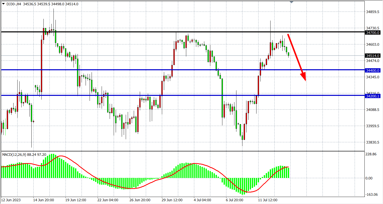 4小时图看,道指在34700关口受阻,MACD量能维持零轴上放量,支撑关注34400附近,阻力34700-35000。