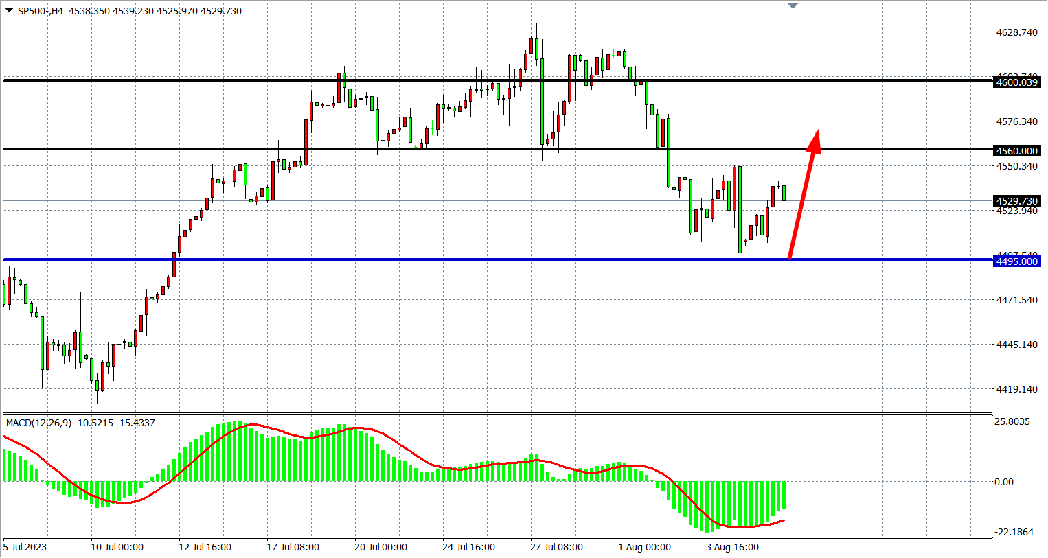4小时图看,标普跌至4490附近企稳反弹,MACD量能在零轴下缩量,行情进入区间,支撑关注4495附近,阻力关注4560附近。