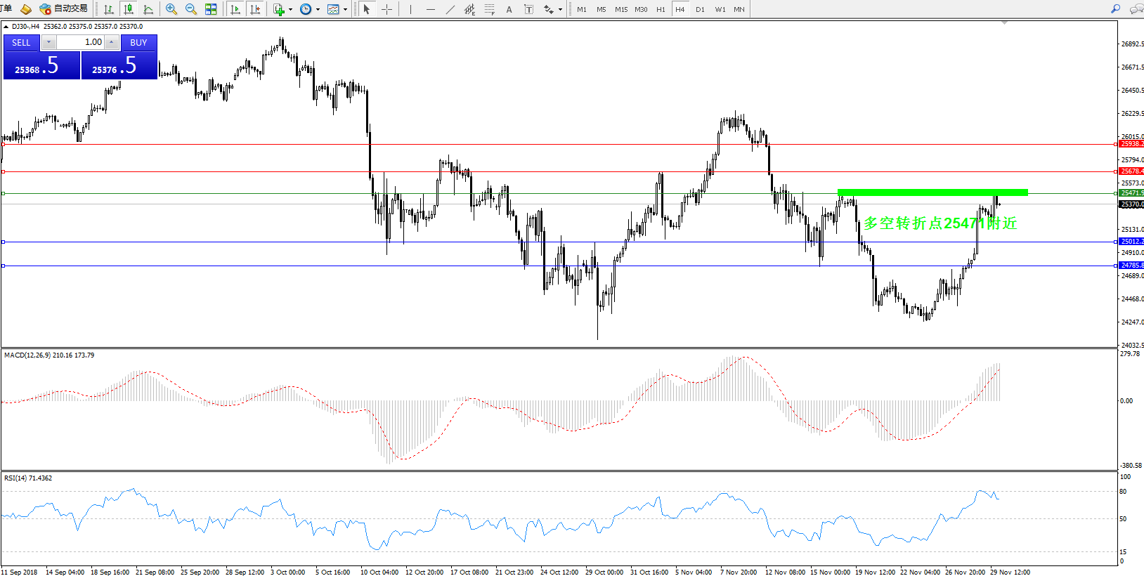 交易策略:破位多空转折点25471上行做多,目标25678——25938;